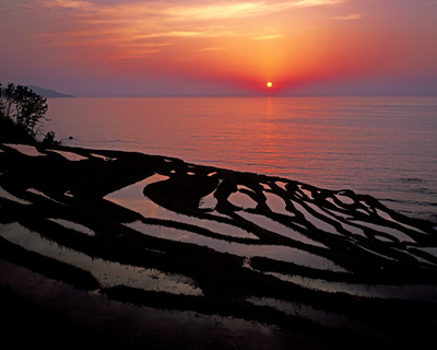 白米の千枚田と日本海に沈む夕日 棚田百選