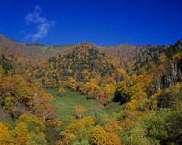 黄葉の三国峠から展望する樹海とウペペサンケ山朝景