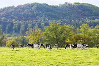放牧の乳牛と青空の大山