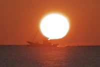日の出と海と漁船