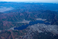 河口湖と富士河口湖町の町並みより山中湖と富士山