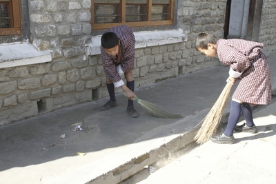 朝の校庭 庭を掃く少年