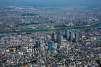 多摩川とNEC玉川事業場,武蔵小杉駅周辺のマンション群周辺より多摩川河口方面