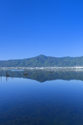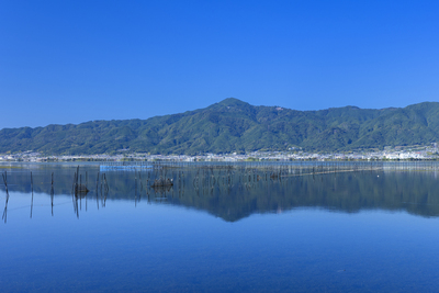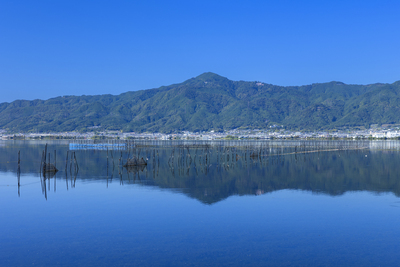 比叡山と大津市市街とエリのリフレクションと青空