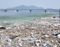 笹ヶ瀬川に下流に流れ着いたゴミ