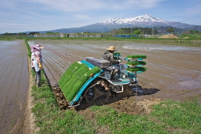 コシヒカリ発祥の地(宇津野新田)・八海山をバックに田植え