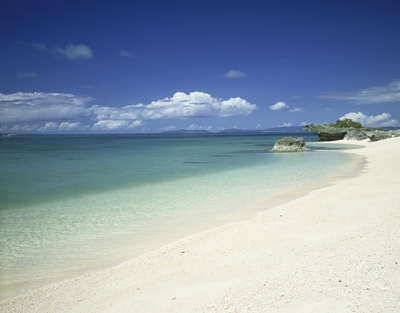 白砂とエメラルドグリーンの海と白い雲。黒島