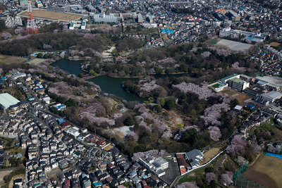満開の桜の県立三ッ池公園と花見見物人