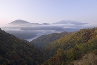 磐梯吾妻レークラインから朝霧の秋元湖と白布山と磐梯山