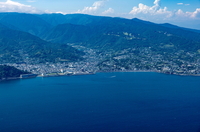 相模灘より湯河原の街並みと箱根の山並み