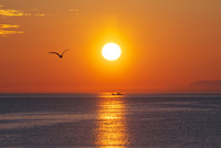 オホーツク海の日の出と漁船