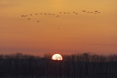 マガン飛ぶ宮島沼の朝陽