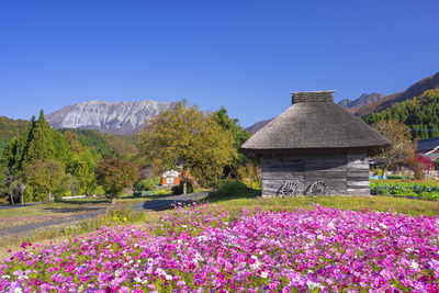 コスモス咲く茅葺き小屋と大山