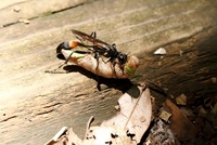 ホソバシャチホコの幼虫を運ぶミカドジガバチ